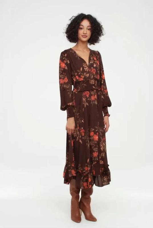 Довга сукня з креп-шифону з набивним малюнком. - Вафельна збірка на плечах, манжетах і талії. - V-подібний виріз із зав'язками зверху, довгі пишні рукави і оборка по низу. - Без підкладки. На розмір S/М. Довжина 125см. Ширина під рукавами 44см( півобхват). Купували на розетці, не одягали. Бірок паперових немає.