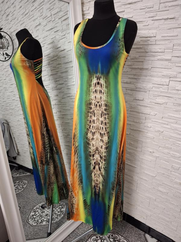 Ефектна сукня. Тканина масло. Не мнется и не линяет. Обладает эластичностью. Красиво спадает к низу. Можно поддеть лифончик, потому что плетение закроет лямки. Размер M. Стан новой вещи. Длина 133см.
