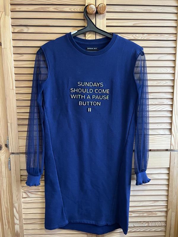 Стильна сукня прямого крою темно-синього кольору. На грудях розташований напис "SUNDAYS SHOULD COME WITH A PAUSE BUTTON". Особливістю моделі є довгі напівпрозорі рукави з сітчастого матеріалу, що додають легкості та елегантності. Низ сукні має асиметричний крій. Матеріал: Трикотаж (основна частина), сітка (рукави). Розмір: S-M. Сукня ідеально підійде для повсякденного носіння, а також для створення оригінального образу. Комфортна та практична.