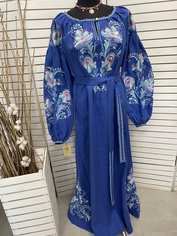 Довга лляна натуральна сукня з вишивкою вишиванка з кишенями