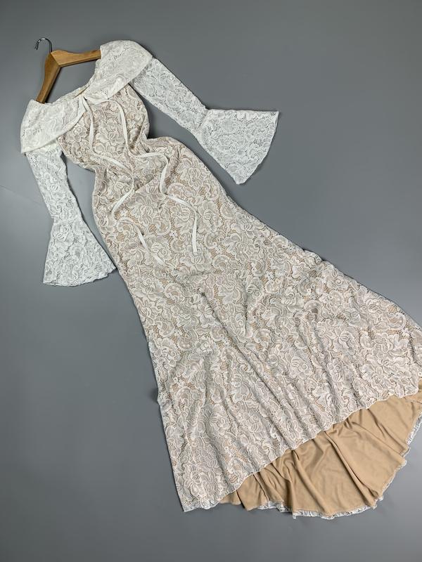 Неймовірна ажурна сукня максі зі шлейфом на бежевій підкладці від бренду Пушка. Тканина мʼяка та добре тягнеться та лежить по фігурі. Ціна сайту дорожча. Підходить на будь-яку святкову подію, новий рік або фотосесію. ▪️Розмір: пише S буде на М ✍Заміри: Добре тягнеться ПОГ-35см ПОТ-28см ПОБ-42см Довжина рукава-61см Довжина виробу-130/155см