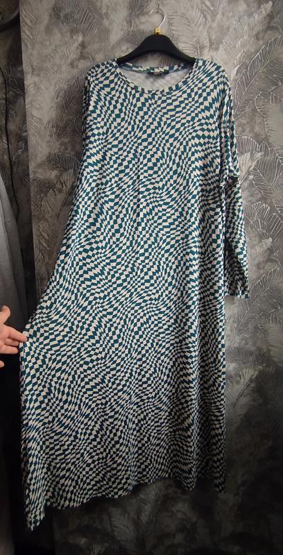 Интересное стрейчевое платье, 20 размер по бирочке, длинный рукавчик, зауженный к низу, платье А силуэта, мерочки нет, и оно как стрейчевая вискоза Замеры: ог 144см, об 160см, длина 127см