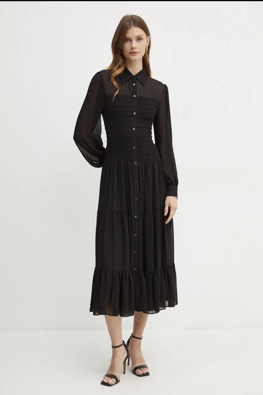 Сукня з колекції MICHAEL Michael Kors виготовлена з гладкої тканини. Поліестер гарантує підвищену стійкість до заломів. - Розкльошений фасон. - Коротка застібка на ґудзиках сприяє ефективній вентиляції, вільному вдяганню та стягуванню. - довгий рукав. - Манжети на ґудзиках. - модель на підкладці. - Довжина рукава: 60 см. - Довжина: 130 см. - Цей товар частково виготовлений із переробленого поліестеру. тип Planet friendly: Planet friendly Декольте: на застібці Декольте: з коміром Довжина: тахі Матеріал: тканина Привід: casual Принт: гладкий Рукав: довгий Фасон: клеш