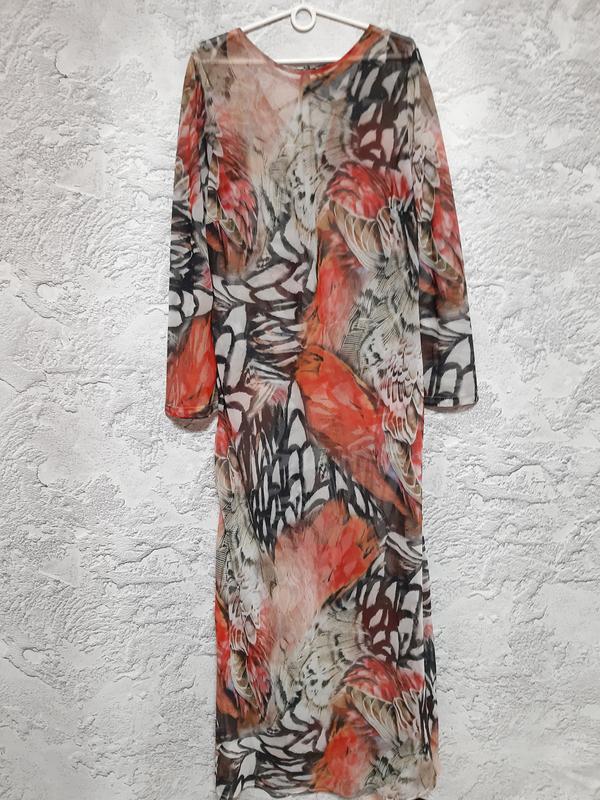 Необычайно красивое длинное полупрозрачное платье-макси с абстрактным принтом в размере 18 от бренда River Island. Платье имеет длинные рукава, V-образный вырез горловины и прямой крой, расширенный к низу макси длины. Принт представляет собой смесь анималистичных мотивов, напоминающих леопардовые пятна, полосы зебры или узоры крыльев бабочки. Узор абстрактный и динамичный. Основные цвета включают яркие оттенки красного и кораллового, смешанные с черным, белым, кремовым и серым тонами. Идеально подойдет для создания многослойного образа, также ее можно носить как тунику или пляжный наряд. Длина 158 см Длина рукава 70 см Ширина рукава 25 см ПОГ 65 см ПОТ 65 см ПОС 78 см
