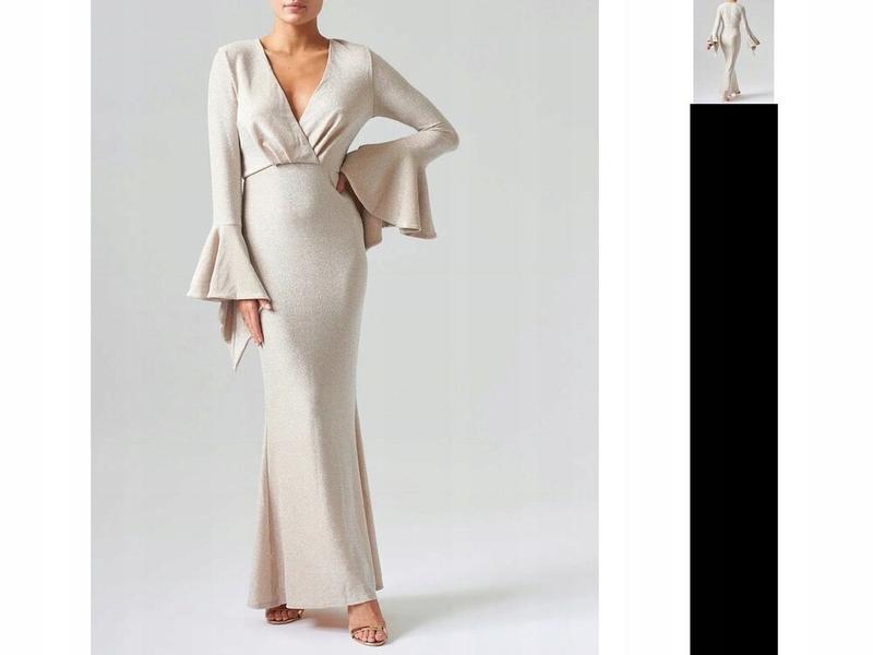 Елегантна вечірня сукня Forever Unique, розмір 34 (підходить на S–M) Вишукана довга сукня від британського бренду Forever Unique, створена з м’якого еластичного трикотажу, який чудово тягнеться та підкреслює фігуру. Матеріал із делікатним блиском красиво відбиває світло та створює дуже ефектний силует. Глибоке V-декольте, акцентні розкльошені рукави та витончена посадка додають сукні святковості та особливого шарму. Ідеальний варіант для вечірки, святкування або урочистої події. По нижньому краю є кілька невеликих затяжок, але під час носіння вони зовсім не помітні. Бренд: Forever Unique Розмір: 34 (еластична, підходить на S–M) Стан: дуже гарний Тканина: трикотаж з легким блиском Посадка: облягаюча, комфортна, тягнеться