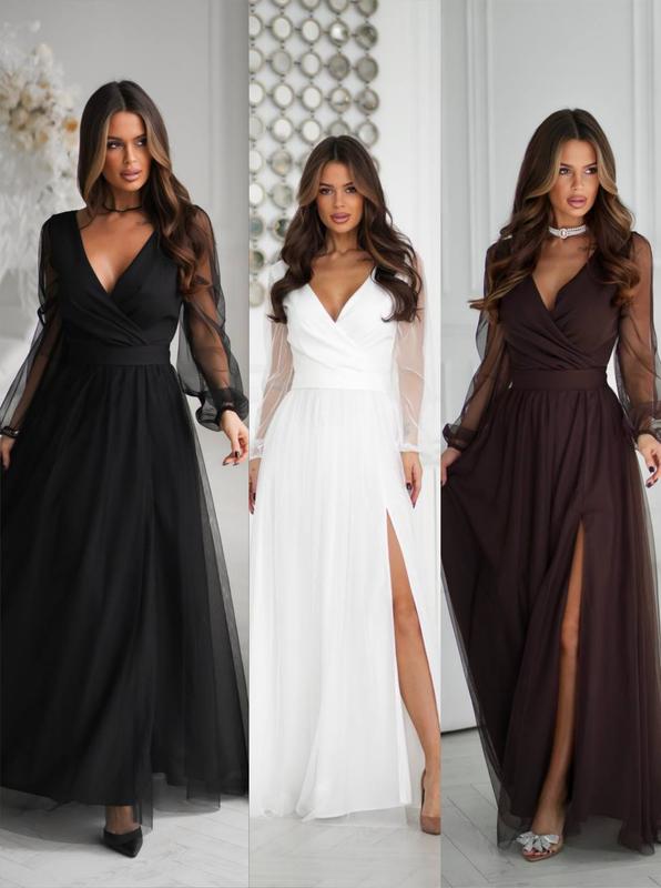 Модель: 7567 Размеры: S (42),M (44),L (46),XL (48) Цвета: черный, молочный, шоколад Ткань: костюмка + сетка, подкладка софт Длина: 150 см ⸻ Утонченное длинное платье с мягкой сеткой и высоким разрезом на ноге. Модель имеет V-образный вырез на груди на запах, формирующий женственную и выразительную линию декольте. Вырез на спине добавляет образу соблазна и утонченности, делая силуэт более открытым и эффектным. На талии - съемный пояс, который подчеркнет линию талии. Юбка из сетки красиво и плавно двигается при ходьбе, создавая нежную, почти воздушную облачность вокруг. Высокий разрез добавляет нотку соблазна, оставляя образ эстетичным, элегантным и благородным.