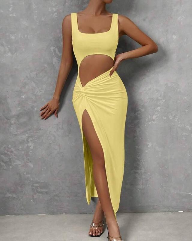 Довга лимонна жовта сукня з квадратним вирізом максі футляр в обтяжку з відкритою ногою пл...