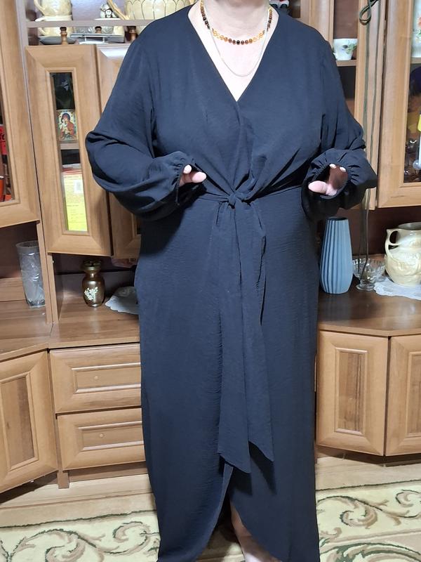 платье длинное, черного цвета, на запах, на резинке, рукав длинный на резинке. длина платья 150см, длина рукава71, пог66, пот60(на резинке). на высокий рост.