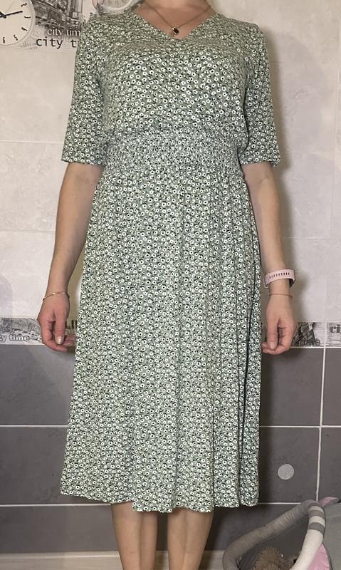 Платье, длина ниже колен, фирма bodyflirt 44/46 размер. Резиночка на талии. Приятный светлооливковый цвет в маленький цветочек.