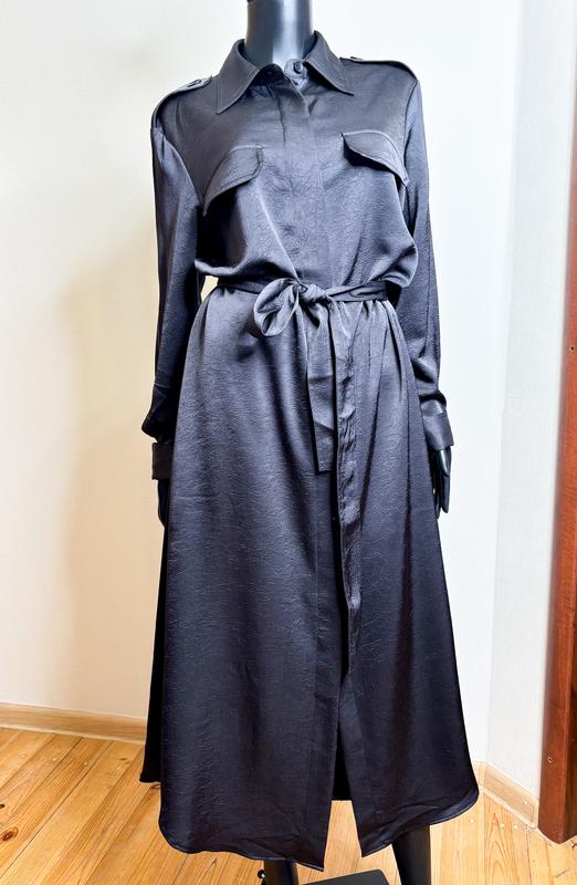 Чорна довга сукня-сорочка Mango в ідеальному стані. Приховані ґудзики, нагрудні клапани, погончики, вишуканий манжет з відворотом, тканина з жатим ефектом, що створює ніби візерунок на поверхні, приємна до тіла, легко переться та прасується. Довжина по спинці від коміру 120 Ширина в грудях 53 Ширина в талії 51 Ширина в стегнах 55
