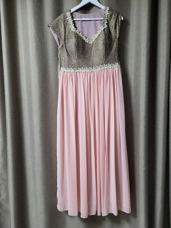 Платье макси очень красивое. Верх блестящая сеточка обработана вышитыми цветами, наз мягкого шифона. Пудровый цвет. По наборке это 48 размер но лучше ординтироваться на замеры. Замеры : об/грудь 108, об/талия 90, об/бедра 110, длина 140. молния сбоку.