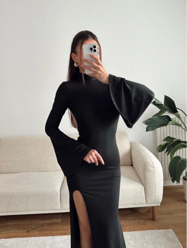 Сукня Мод 155 Розмір - 40-42,44-46 Тканина - віскоза 🌈Колір - чорний, червоний Сукня довжини максі, з глибоким вирізом на спині, доповнена комірцем - стійкою, а також має розкльошені рукави Ціна 780 грн