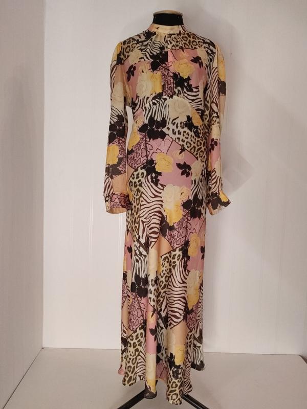Платье без подкладки, ткань напоминает искусственный шелк. Спереди линия талии завышения. Полуобъем по груди 58 см Полуобъем по талии 52 см Полуобъем по бедрам 70 см Длина рукава 69 см Длина платья 150 см
