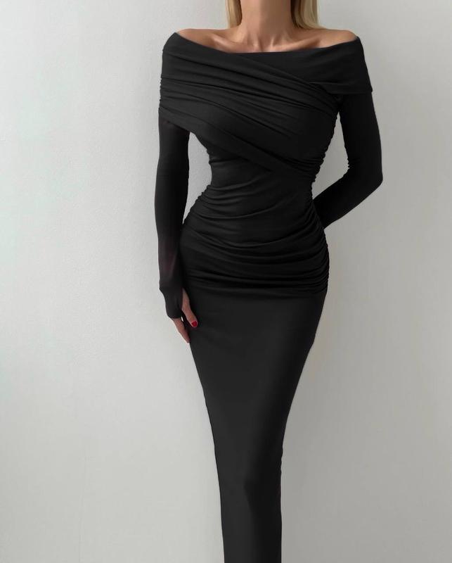 Жіноча облягаюча довга сукня з відкритими плечима Мод.220 Розмір:42-46 Тканина: трикотаж Кольори: марсала,шоколад,чорний Ця сукня максі з еластичного трикотажу з відкритими плечима і вишуканою драпіровкою поєднує в собі елегантність та спокусливість. Ідеально підходить для вечірніх виходів та урочистих заходів, ця сукня подарує вам впевненість та зробить вас центром уваги.