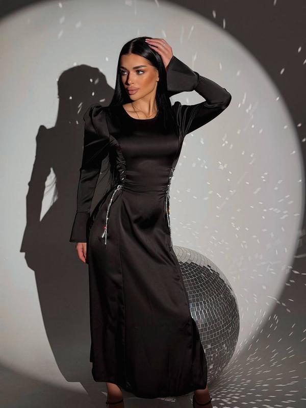 Размерный ряд S,M,L,XL Ткань качественный двойной шелк, не путать с тонким Цвета черный, молоко, красный, бардо и шоколад По бокам платья очень красивые блестящие шнурки с камнями Стильная, нарядная и очень классная модель Шнурок мягко регулировать и делать длинным! Застегивается на молнию