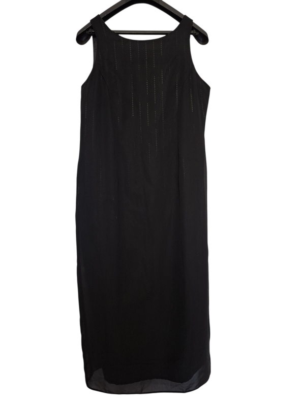 Шикарне довге чорне плаття з підкладкою верхня тканина з кружечками також чорного кольору ПОГ 52 см ПОТ 49 см ПОБ59 см ПОН 61 см довжина плаття 127 см довжина розпірки ззаду 42 см ззаду блискавка майже до стегон