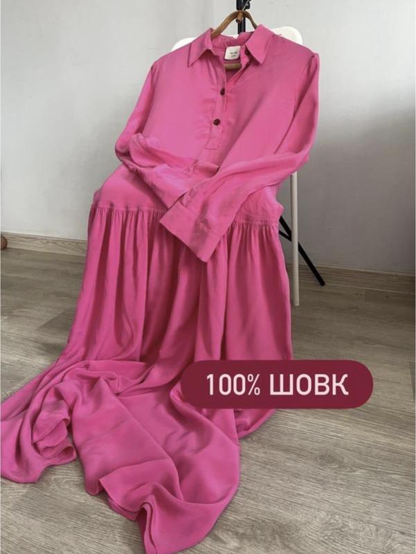 Елегантна шовкова максі сукня від італійського бренду Alysi у яскравому рожевому кольорі. Особливості: • Матеріал: натуральний шовк преміум якості • Силует: вільний крій з заниженою талією • Комір-сорочка з застібкою на гудзики • Довгі рукави з манжетами • Спідниця з пишними складками Параметри: • Розмір: L (євро) • Довжина: 137 см • Обхват грудей: 57 см • Довжина рукава: 63 см • Стегна: вільного крою Стан: новий, люкс якість. Ідеально підходить для особливих випадків та повсякденного елегантного образу.