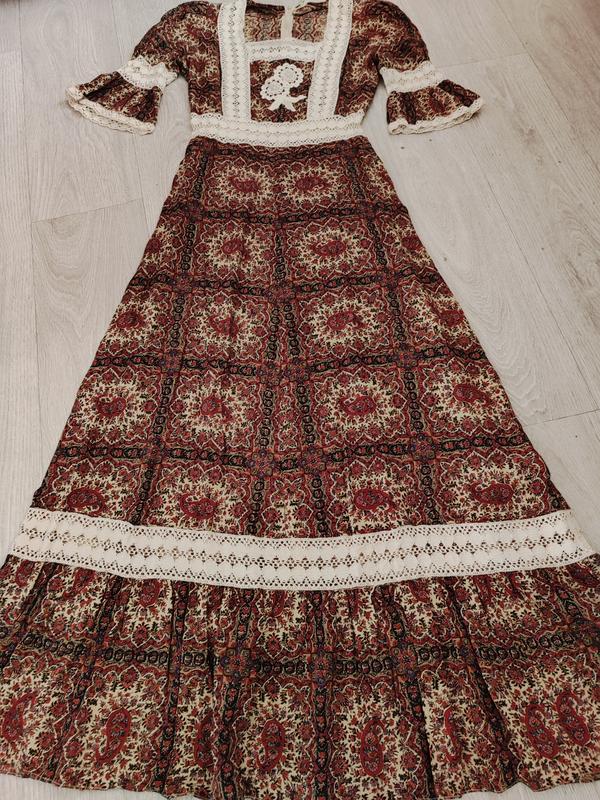 Очень красивое винтажное платье,100% вискоза. Очень красиво пошита, старезненное коттоновое кружево молочного цвета, замочек на спинке,етно винтаж стиль. Состояние отличное. Замеры пог 44см пот 34сы длина 137см рукав 35см. В цену входит Ассоциация Шаффи. оплата на карту одразу.