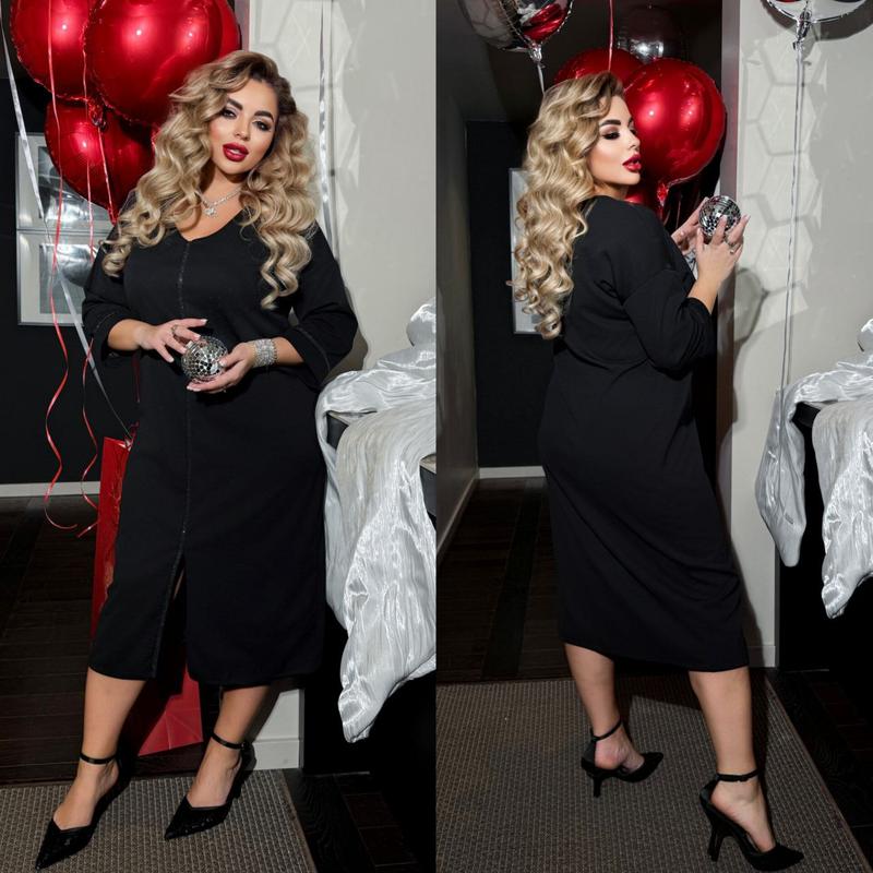 🎄Сукня🎄 Модель: 313 ❤️Размер: 52-54, 56-58, 60-62, 64-66 ❤️Цвет: черный Ткань: крепдайвинг Элегантное, лаконичное платье, ткань тянется. Идеальный вариант, как на каждый день, так и на праздник. Тонкая полоска из впаянных камней на ленте, вытягивает силуэт. Прямой крой, V- образный вырез горловины, рукав 3/4. Платье, которое станет самой любимой в гардеробе. ❤️Замеры:❤️ ❤️52-54 Обхват грудей: 112 см Обхват стегон: 120 см Длина рукава: 33 см Длина изделия: 115 см ❤️56-58 Обхват груди: 120 см Обхват стегон: 128 см Длина рукава: 33 см Длина изделия: 118 см ❤️60-62 Обхват груди: 128 см Обхват стегон: 136 см Длина рукава: 33 см Длина изделия: 118 см ❤️64-66 Обхват груди: 136 см Обхват стегон: 144 см Длина рукава: 34 см Длина изделия: 122 см