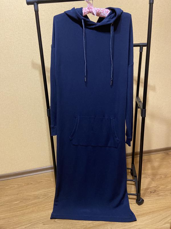 Довга максі сукня - худі з капюшоном від бренду Marks and Spencer, розмір 36, темно -синього кольору. Капюшон на регулюючій стрічці, рукавчики на манжетах, приспущений рукав.є кишенька -кенгуру. Довжина рукава від горловини 71 см, пів обхват під руками 53 см, пів обхват талії 46 см, стегон 48 см, пів обхват низу 52 см, довжина по боковому шву 96 см, довжина сукні 111 см. Матеріал: 70% віскоза, 27% поліестер, 3 % спандекс. М’який і приємний до тіла матеріал.