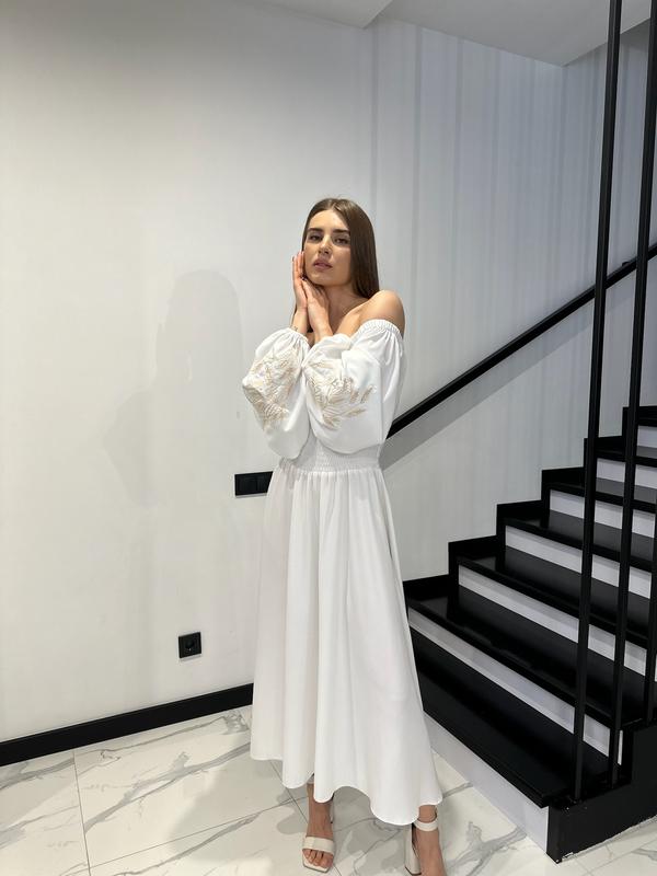 Сукня з вишивкою від українського бренду JO’DA. Колір білий. Тканина тонка костюмка преміум якості, спадаюча тканина та дуже приємна на дотик, досить мʼяка та міцна. На рукавах вишивка у формі золотих колосків. Сукня довжини максі. Рукав довгий. Верх сукні та талія на резинці. Сукню можна носити з приспущеними відкритими плечима або на плечах. Рукава також на резинці. Від талії до низу сукня широкого вільного крою. Сукня гарна нарядна, підійде на святкові події чи ділові зустрічі. Сукня є в наявності в розмірі SM: верх сукні 90-100( резинка), ог 90-110, от 70-84, рукав 64, довжина 115 XXL: верх сукні 99-110( резинка), ог 110-140, от 98-110, рукав 64, довжина 117