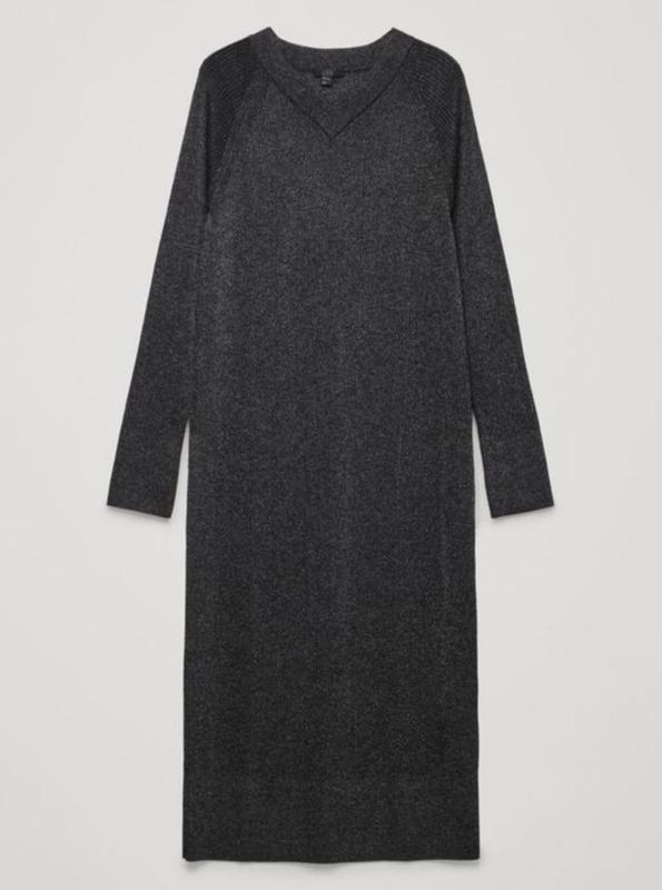 Серое платье с люрексом, в составе шерсть, в рубчик хорошо тянется. Длина 118 пог 47 в не растянутом виде. Не носили
