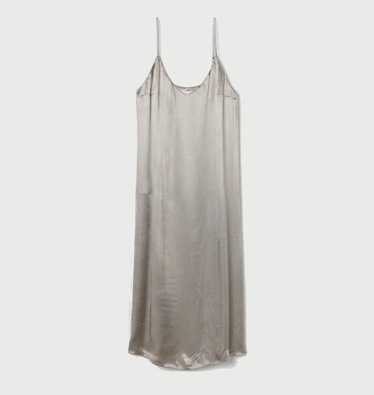 Плаття до щиколотки з м'яко драпіруючого атласу з V-подібним вирізом, вузькими регульованими бретелями та високим розрізом з одного боку. Без підкладки.