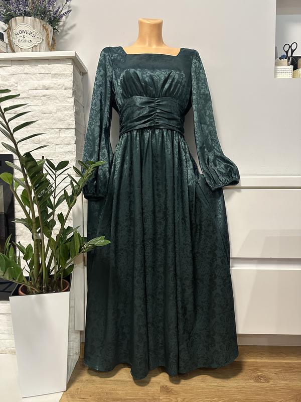 Це смарагдова вечірня сукня від бренду Shein. Сукня має довжину максі ,квадратний виріз, довгі рукави-ліхтарики з манжетами на гумці та характерне плісирування на талії. Р.10,довжина 130,пог49,пот 38,
