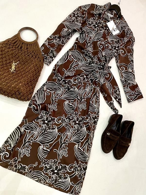 Атласное платье Zara на запах . Красивый шоколадно-коричневый, черно-бежевый современный принт, очень уникальный, с V-образным вырезом, длинными рукавами и открытой юбкой с завязкой сбоку, выглядит очень эффектно !! Новое , подойдет на М, Л