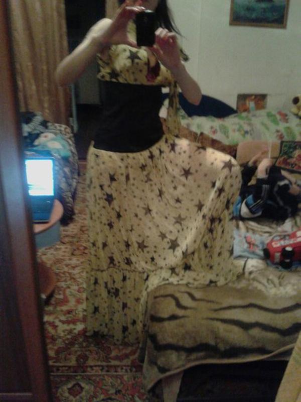 Красивое платье жолтого цвета с черными звездочками перешивала на розмер Sку.Дефектов нет никаких.Цвет как на последнем фото.