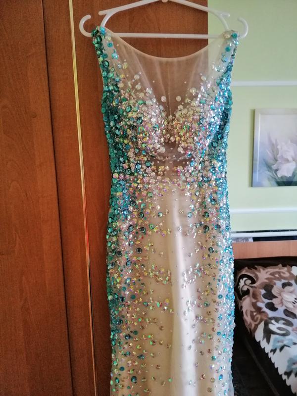 Плаття для урочистих подій, обшите срібно-голубими камінчиками, від бренду JOVANI