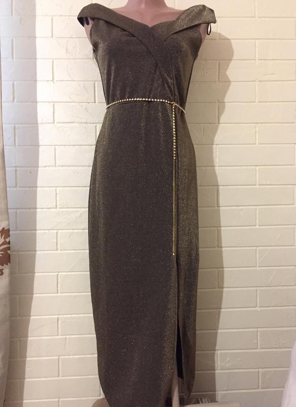 Платье нарядное в золотым люриксе Красиво подчеркивает фигурку. Длина 106см. Грудь 85см. Талия 70см. Бедра 89см. Ткань средней плотности.