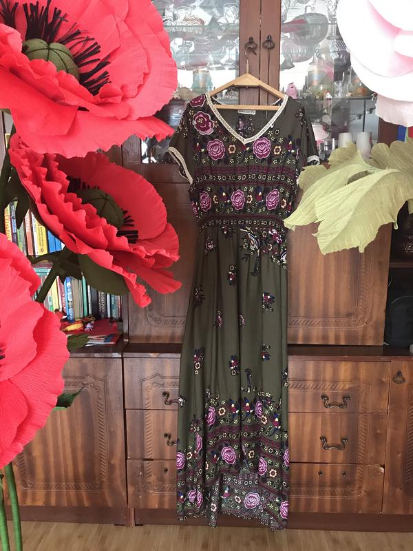 Длинное красивое платье Турция . Перед чуть короче, красивый рисунок и модный цвет хаки. Размер 42 красиво сидит на 44. Одето 1 раз. Очень легкое, на лето идеально подойдёт.