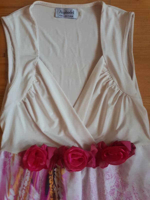 Платье в пол, низ из шифоновой ткани, верх из дайвинга. Под грудью украшение-розы. Сзади на завязках. ПОГ 40, ПОТ 38, длина 137 см. Подойдёт на наш 48 размер.