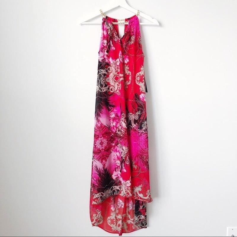 Невероятно красивое платье Jennifer Lopez с цепочкой золотого цвета на горловине, свободного кроя и ассиметричным низом. Параметры модели на фото: грудь - 82, талия - 65, бедра - 91, рост - 171.