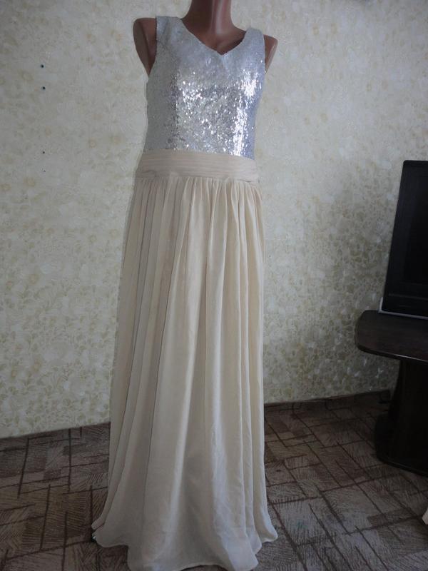 Ткань шифон на подкладке,сверху плотная ткань в паетках. Обхват груди98 см,талии87 см,бедер 112см.Длина 142см.Платье привезенное из-за границы из дорогих вещей,такое в брендовых магазинах больше 3тыс.грн.