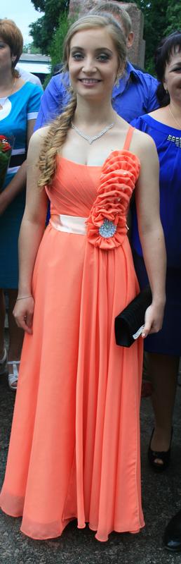 Платье размером 40-42, оранжевого цвета, длинна на рост 160 см + каблук. Одевалось всего 2 часа! на корсете в комплекте, если надо, могу продать украшение(сережки и колье).