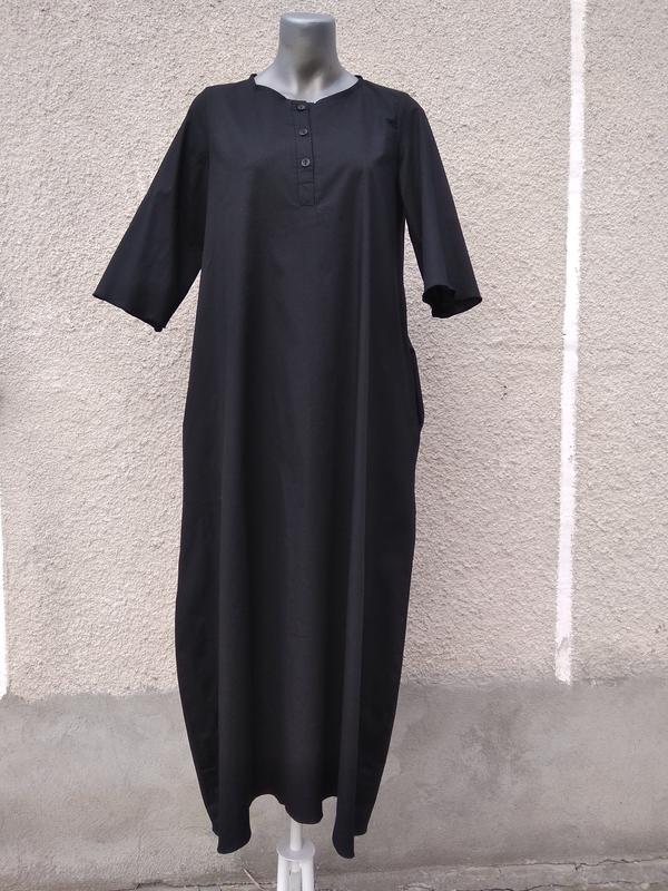 Довге плаття з тонкого котону, рукав 3/4, на ґудзиках, досить об'ємне, не облягаюче. В наявності розміри від 44 до 60