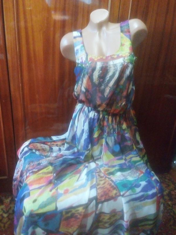 Легкое,воздушное,длинное платье подойдет на 44-46-48 размеры.Расцветка пестрая-яркая.Сбоку глубокий разрез до бедра.Подкладка-короткая юбочка и топик на груди.ПОГ-45см,ПОТ-31-44см,длина юбки-104см(то пояса).