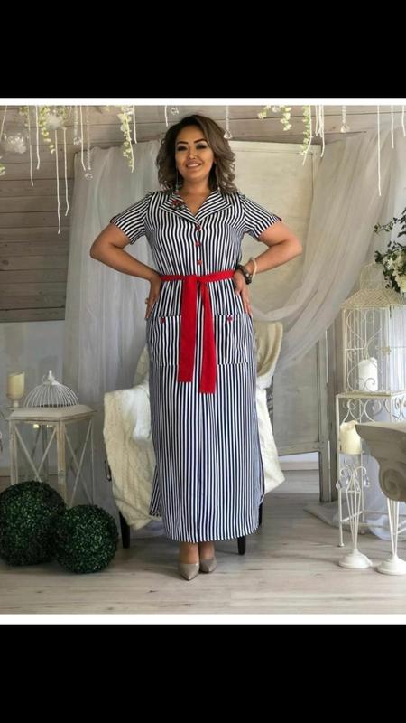 Платье -Рубашка Модель 640VL Цена- 510 грн Размеры - 46-48,50-52,54-56,58-60 Ткань- суперсофт Принт - черно-белая полоска Платье-Рубашка в пол , идеальная посадка ,красный пояс подчеркивает фигуру; клеевая роза под спецпрессом, пуговицы в цвет пояса; платье полностью застегивается на пуговицы; короткий рукав с патиком с пуговицей; по бокам карманы с пуговицами ; на платье по бокам разрезы Vl lubimaa Параметры по внешнему шву изделия: 46-48: ОГ98, ОТ 102, ОБ 108, рукав 20см, длина 134см 50-52 :ОГ106, ОТ108, об118, р21, дл136 54-56 :ОГ 114,от118,об124,р22,дл137 58-60 :ОГ122, от124, об130, р23, дл138