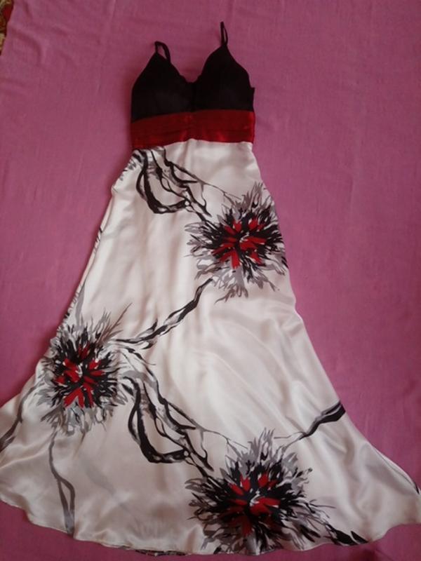 очень красивое атласное платье, в лифе есть чашка которая хорошо держит грудь. сзади на юбке специальная веточка, что-то типа хвоста, очень красиво играет при ходьбе.Длинна 125 см, это без брителей , Брители регулируются. ПО талии 34 см. Одето один раз, покупалась за 1800 грн Состояние новой вещи.