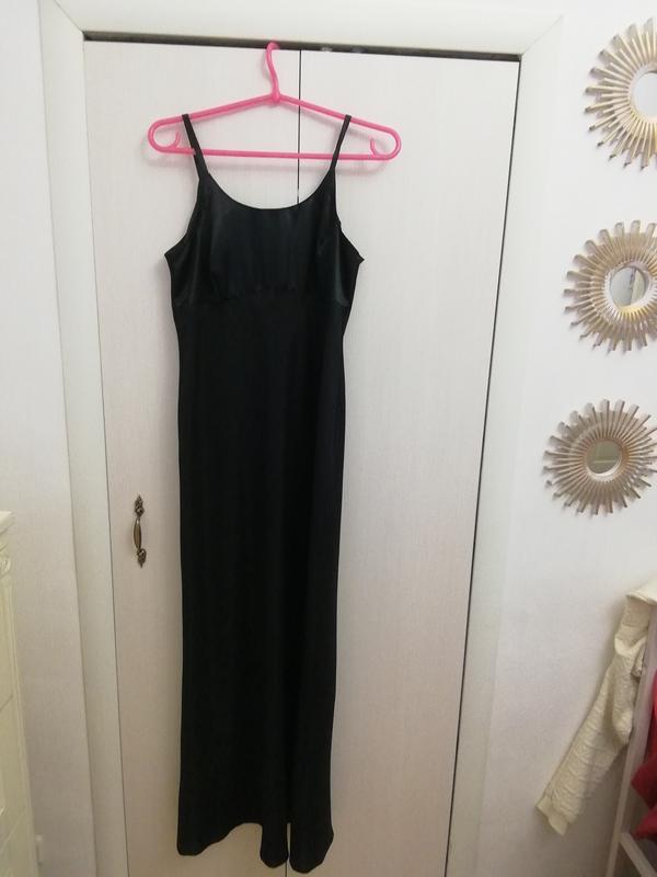 красивое чёрного цвета платье в пол бельевого стиля, с аксессуарами вечером и на футболку днём, оригинальная застежка по спине, очень привлекально смотрятся пуговки, размер 38,кроенное по косой, поэтому талия и бедра от и до. Бедра от 90 до 105,может и больше не на кого надеть для проверки.