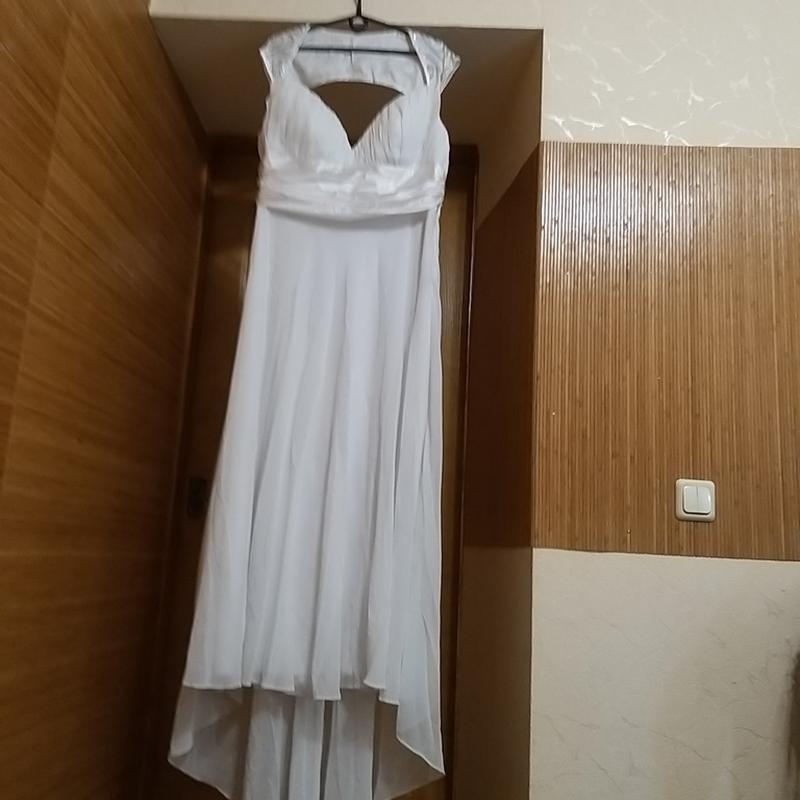Платье очень красивое,что надо открывает,чего не надо прикрывает.Красивая спинка,прикрывает крылышками верх руки.Имеется подклад.Шлейф не очень длинный.Платье садится просто идеально. На наш размер 52-54.Состояние близко к идеальному.Можно использовать,как вечернее или свадебное.Было одето 1 раз на юбилей.