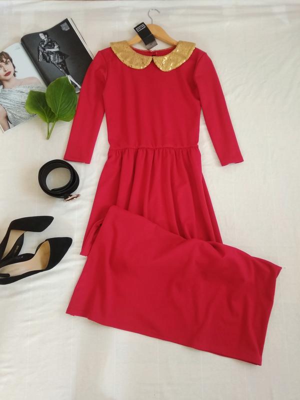 розкішна сукня максі в яскравому червоному кольорі з золотим комірцем, рукав довжини 3/4, талія на резинці, юбка вільно розширюється до низу, тканина трикотаж добре тягнеться, розмір вказано L, підійде і на М, ПО грудей 48 см тягнеться до 55 см, довжина 148 см. Нове з біркою
