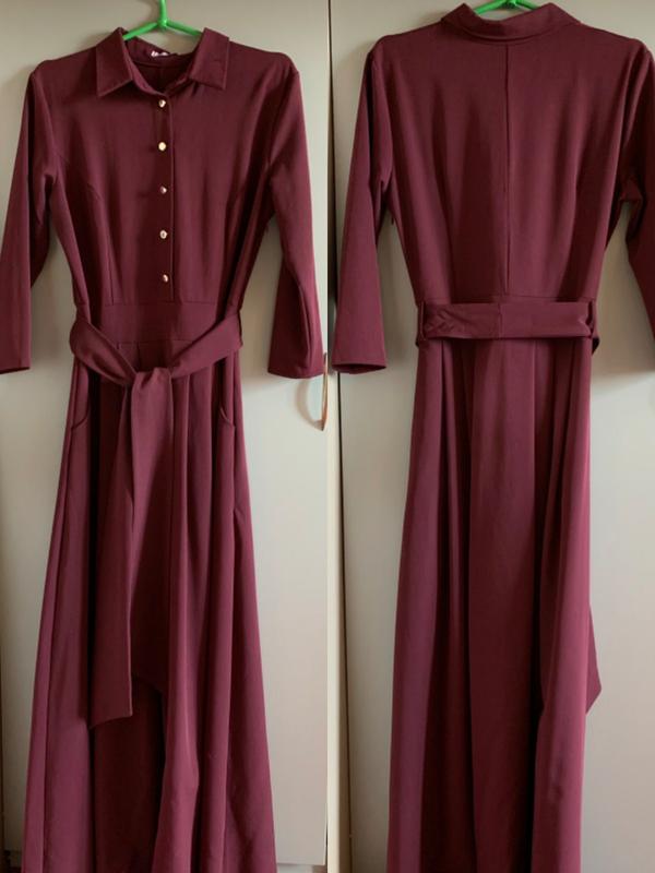 Если у вас есть желание приобрести вещь, просьба прочитать сначала раздел «Про меня», благодаря понятию. Длинное бордовое платье с поясом на размер М, красиво подчеркивает фигуру. Плечи - 40 Подмышки - 45 (ткань немного тянется) Талия - 38 Рукав 3/4 - 46 Длина - 142 На воротнике отпал пуговицу, но он там лишний или можно купить другой (цена 5-10 грн).