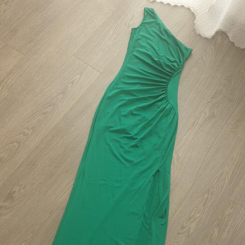 Нарядное платье не одно плечо и длинным разрезом по ножке. Размер сз-с.Есть затяжечки ниже колена,не сильно заметно.