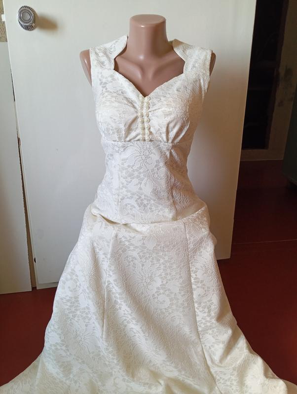 Жаккардовое платье молочного цвета для худенькой девушки. Ткань смотрится богато - как набитое кружево сверху.Длина платья- 147см, ширина плеч- 35,5см, полуобхват под грудью-33см,размер бюста №1, размер приблизительно 42-44. Мой рост 167 см.Подчеркивает фигуру и стройнит.Сбоку вшита молния, подкладка атласная. Дополнительные фото сделаю при надобности.