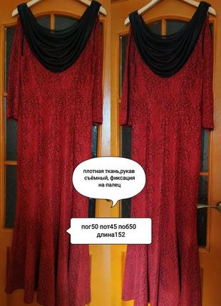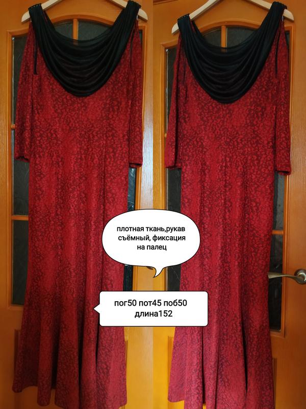 Юбка от бедра струится, рукава одеваются отдельно ,фиксируясь на пальцах.Ткань плотненькая, не просвечивает, на т.бордовом поле принт красного цвета с поблёскиванием-очень зффектно и празднично выглядит! Классно подчёркивает красоту фигуры, стройнит.ДИ-152, ПОГ-50, ПОТ-45, ПОБ-52см. В бонус- туфли красные на высоких каблуках( см. мои объявления) или босоножки на шпильках.