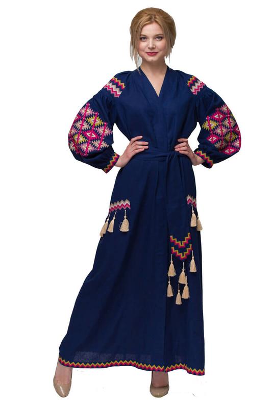 Сукня має потайні застібки-кнопки ,вишиті бокові вставки прикрашені китицями(кутасиками) пояс з вишивкою прикрашений китицями . Вишивка – «французький хрестик» Сукня «Барвограй» – стане гарним придбанням для панянок, що цінують ексклюзивні вишукані речі. Дійсно, ця сукня заслужено відноситься до розряду особливих завдяки стильному фасону, багатій вишивці і високоякісній тканині. Гуцульська вишивка розкинулась на об’ємних рукавах сукні-вишиванки «Барвограй». Виконана з натурального льону та вишита технікою «французький хрестик», вона має прямий крій та потайні застібки по усій довжині. Вдалий підбір кольорової гами грає барвами на полотні та передає красу гуцульського колориту. Символіка вышивки: Геометричні орнаменти несуть в собі символічний зміст, який зосереджувався навколо прадавніх ідей плідності, примноження, гараздів і захисту від злого ока. На Гуцульщині такий вид орнаменту , називають – «очка», «ромби» , а також він зустрічається на жіночих запасках Житомирського Полісся – це один із найдавніших типів поясного незшитого двоплатового вбрання, що побутувала до кінця 19 ст.