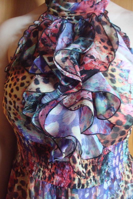 платье размер М. очень красивое с подкладкой трикотажной. вверх-шифон. .длина от подмышки и вниз-118 см,сзади резиночка по спинке и спереди под грудью тоже ,приблезительно по линии талии -35 см.резиночки дают возможность тянуться до обьема который нужен.